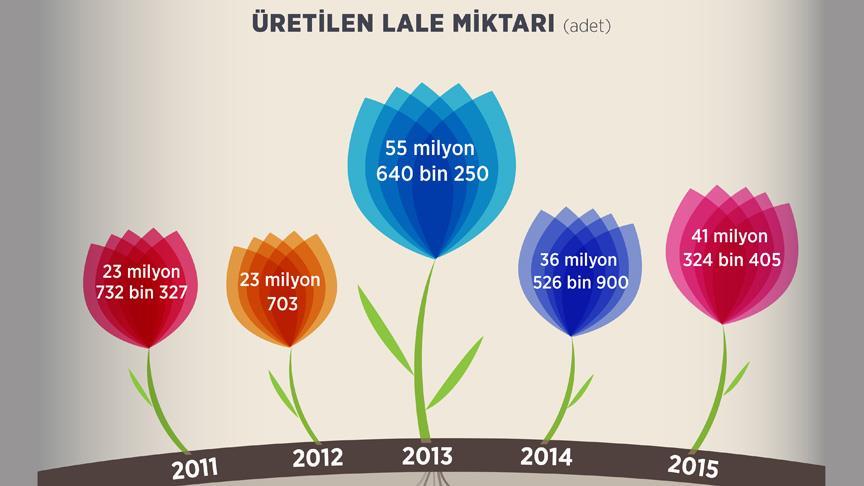 Üretilen lale miktarı 2011 yılında 23 milyon 732 bin 327 adet olarak hesaplanırken, bu rakam 2012'de 23 milyon 703, 2013'te 55 milyon 640 bin 250, 2014'te ise 36 milyon 526 bin 900 adet oldu.