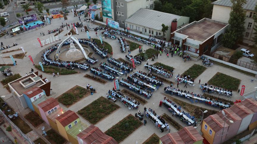 15 Temmuz Demokrasi Meydanı'nda kurulan iftar sofrasına konuk olanlar, belediyenin ramazana özel hazırladığı ambalajlarda kendilerine ikram edilen 4 çeşit yemek ve tatlıyla iftar yapıyor.