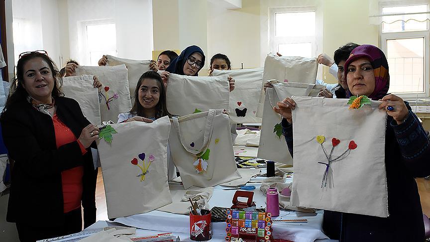 Okulun atölyesinde hummalı bir çalışma sonrasında dikilen çevreci bez çantalar, vatandaşlara ücretsiz dağıtılacak.