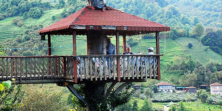 Rize'nin Fındıklı ilçesinin Çağlayan köyünde yaşayan Mehmet Aydoğan, Çağlayan Vadisi'ndeki manzarayı daha iyi görebilmek için evinin önünde bulunan gürgenin gövdesine yerden 5 metre yükseklikte kameriye yaptı. Ev ile kameriye arasına 10 metre uzunluğunda tahtadan köprü yapan Aydoğan, misafirlerini çoğunlukla vadiye hakim bu kameriyede ağırlıyor.