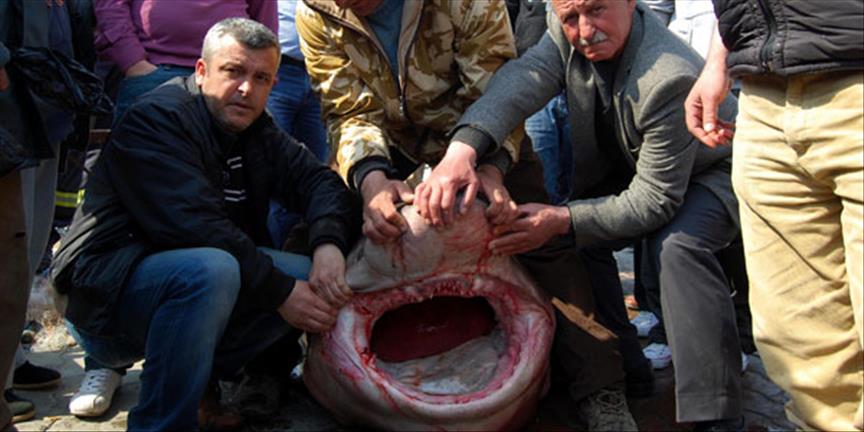 Marmara denizine kıyısı olan Marmaraereğlisi ilçesi sahili açıklarında balıkçıların ağlarına 1 ton ağırlığında, 5 metre uzunluğunda camgöz cinsi köpek balığı takıldı.