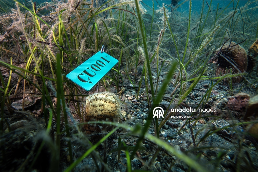 Erdek Körfezi'nde deniz çayırlarıyla kaplı ve kumlu bir habitatta toplam 200 metrekare alanda yaşayan 330 pina markalandı.
