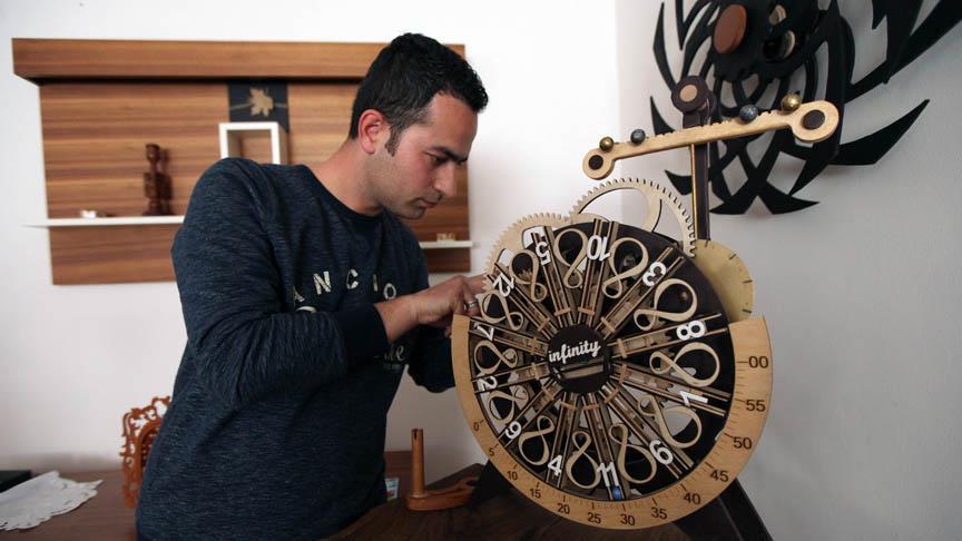 Samsun'un Bafra ilçesinde matematik öğretmenliği yapan 33 yaşındaki Sinan Çınar, tamamen ahşap malzeme kullanarak kurmalı saatler tasarlıyor.