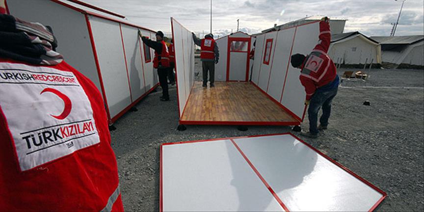 Kızılay'ın Van'ın Erciş ilçe merkezine ulaştırdığı Mevlana Evleri, Mehmetçik ve Kızılay görevlileri tarafından kuruluyor.***