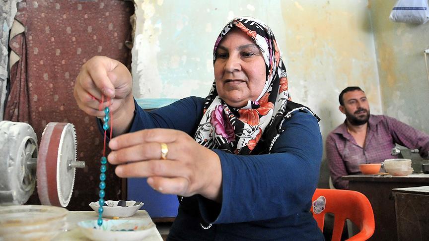 Şanlıurfa'da 60 yaşındaki ev kadını Hatice Gelmiş, Şanlıurfa Büyükşehir Belediyesinden aldığı mikro krediyle açtığı tespih atölyesinde damadına ve 3 çocuğuna iş olanağı sağladı.