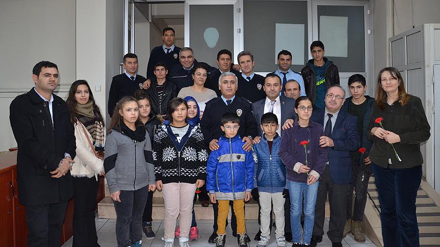 Ziyarette, çocuklar polislere çiçek verdi.