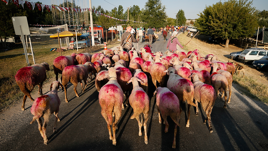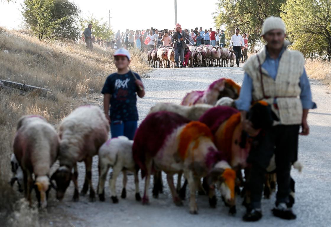 Koyunların öncüsü yarışma için özel hazırlanıyor ve etkinlikten iki gün önce kırkılarak mor, sarı ve kırmızı renklere boyanıyor.0