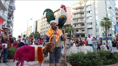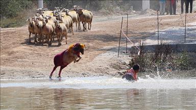 Denizli'nin Çal ilçesinde 8 asırdır sürdürülen "Sudan Koyun Geçirme Yarışması"na katılacak çobanlar, koyunların süsleme işlemlerini tamamlayarak temsili yörük göçünü canlandırdı. Çobanlar, gün batmadan Aşağıseyit Mahallesi'nde buluşarak yöresel kıyafetleriyle sürüleri eşliğinde kortej yürüyüşü yaptı. ( Mahmut Serdar Alakuş - Anadolu Ajansı )