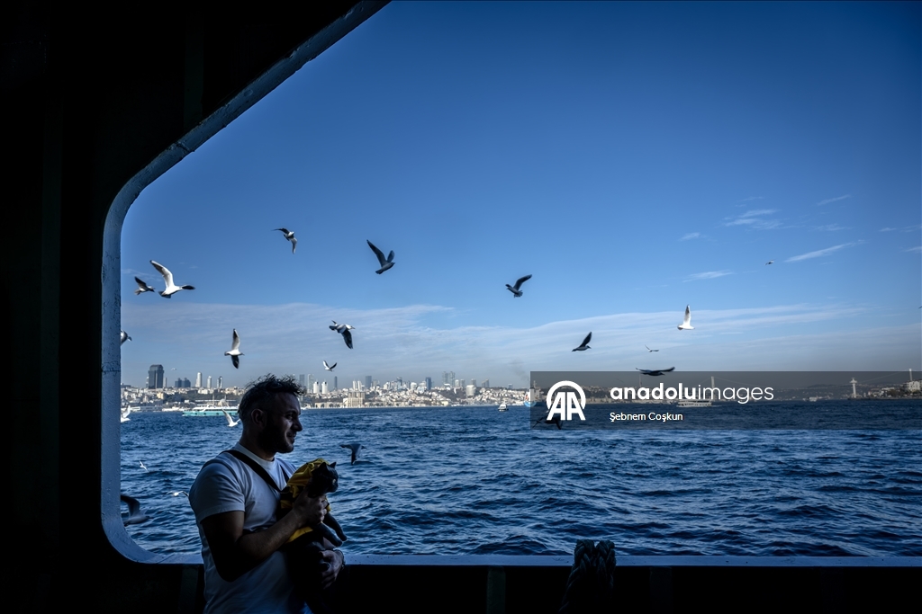 Rüzgarla hareket eden tüyleriyle motosikletin önünde tarihi kenti izleyen "Gofret", arabalı feribotta da sahibiyle martıları besleyip Boğaz'ı seyretti.