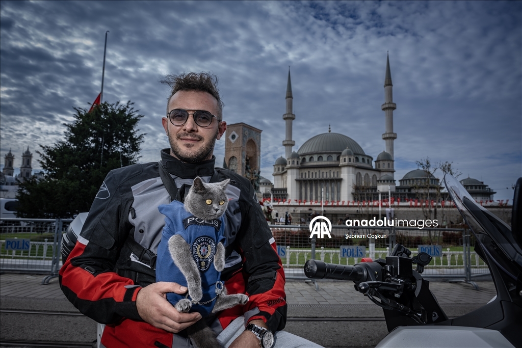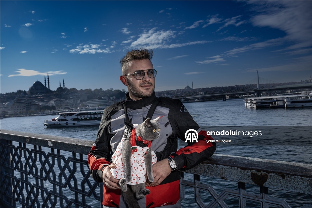 Motosikletli sahibinin göğsüne bağlı aparatta Muğla'nın Fethiye sokaklarında gezmeye alışan "Gofret" isimli kedi, polis, gelinlik ve arı gibi rengarenk kostümler giyip kaskını takarak, bu kez İstanbul'da dolaştı.