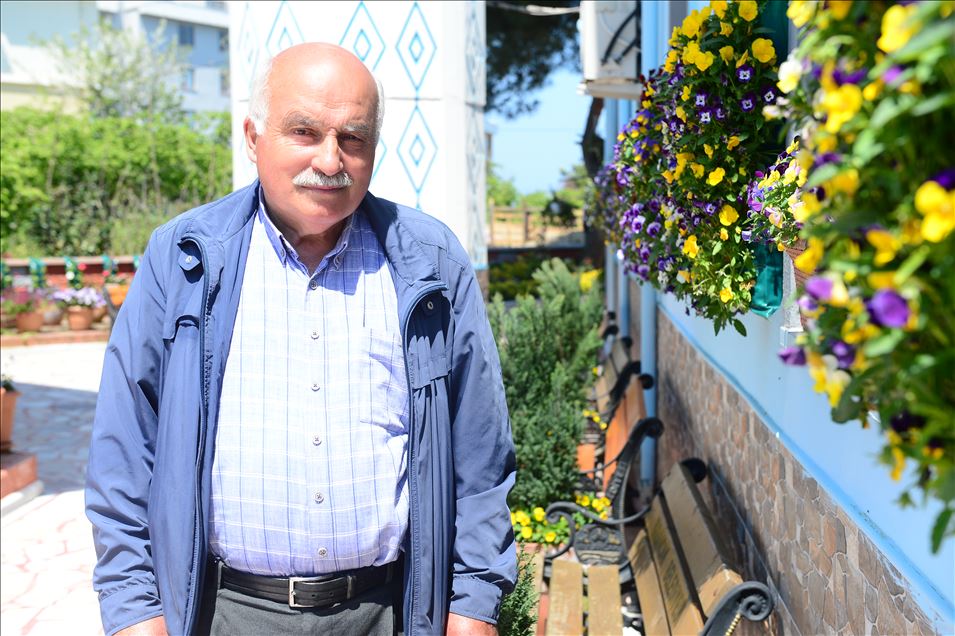 Giresun'un Bulancak ilçesine bağlı Yalıköy'ün 61 yaşındaki muhtarı İsa Kırbaş, caminin etrafını rengarenk çiçeklerle donattı.