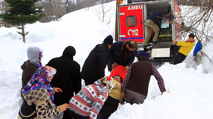 Rize'nin Derepazarı ilçesinde kar nedeniyle ulaşım sağlanamayan köyde rahatsızlanan obezite hastası Faziye Ergün, sağlık ekipleri ve köylüler tarafından kar paletli ambulansa taşındıktan sonra hastaneye ulaştırıldı.