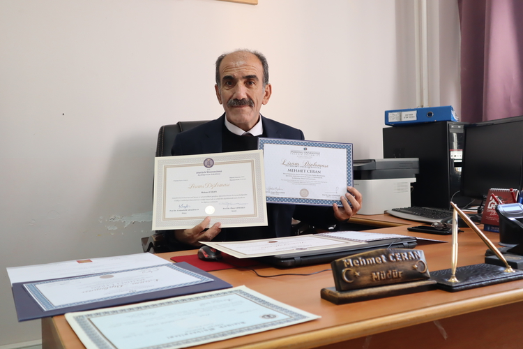 Kahramanmaraş'ın Afşin ilçesinde lise müdürü 56 yaşındaki Mehmet Ceran, din kültürü ve ahlak bilgisi öğretmeni olduktan sonra eğitim ve öğrenme tutkusu sayesinde 11 üniversite diploması daha aldı.