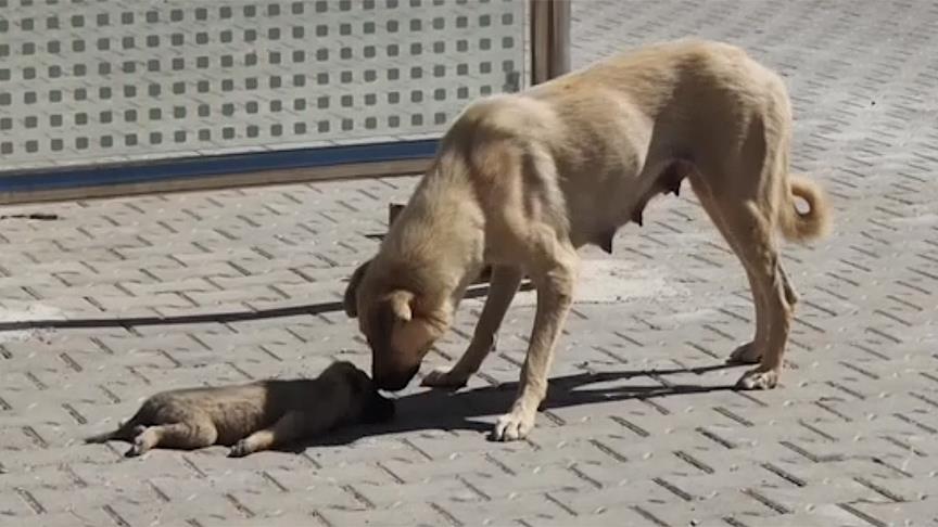 Saatlerce yavrusunun başından ayrılmayan anne köpeğin, zaman zaman yaladığı yavrusunu canlandırmaya çalışması görenleri duygulandırdı.