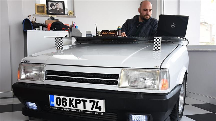 Bartın'da otomobil tutkusunu ofis ortamına taşıyan oto galeri sahibi Aykut Kaptan, hurdaya çıkan 1992 model Şahin marka otomobili çalışma masasına dönüştürdü.