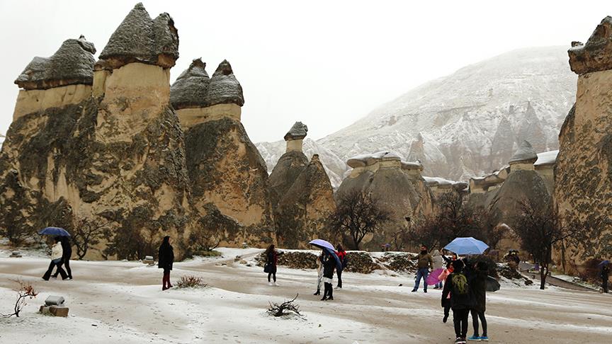 Türkiye'nin önemli turizm merkezlerinden Kapadokya bölgesinde, gece başlayan kar yağışı nedeniyle peribacaları ve doğal kaya oluşumları beyaza büründü.