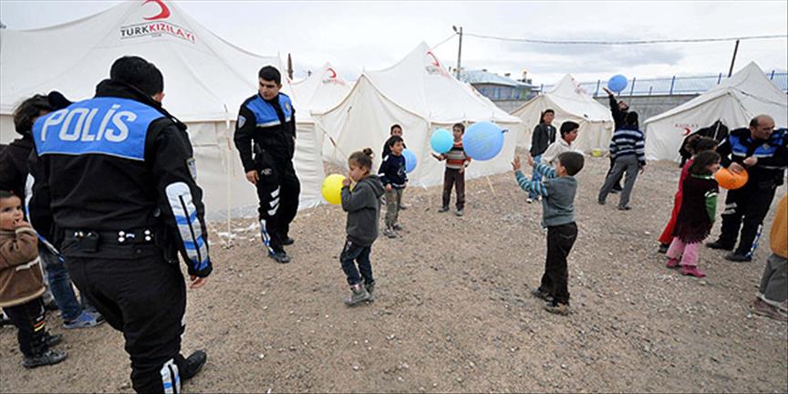 Kent merkezindeki Et ve Balık Kurumu mevkisinde 187 çadırın yer aldığı Türk Kızılayınca kurulan çadırkentte gönüllü olarak ihtiyaç sahiplerini belirleyip, ailelere yardımların eksiksiz ulaşmasını sağlayan polisler, bir yandan da çadırkentte yaşayan çocukları balon ve çeşitli oyuncaklarla sevindiriyor.