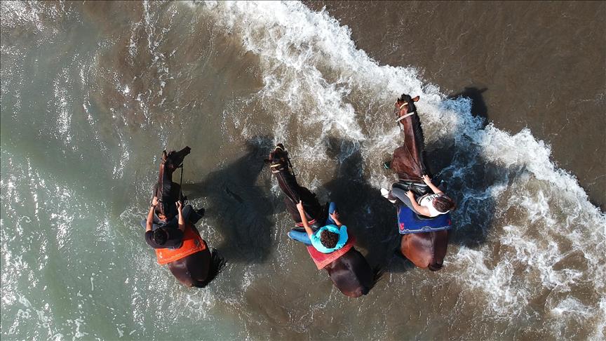 Burada her yaştan meraklıya at biniciliği ve atlı okçuluk gibi çeşitli eğitimler verilirken, ziyaretçilere de sahilde at binme imkanı sağlandı.