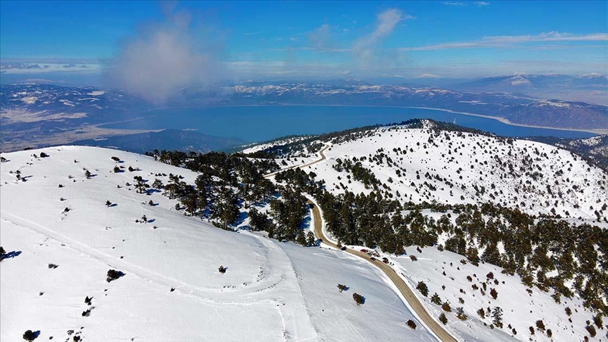 Özellikle Antalya, İzmir, Denizli ve Muğla'dan bölgeye gelenler, kayak merkezine çıkarken Salda Gölü'nün güzelliğini izliyor.