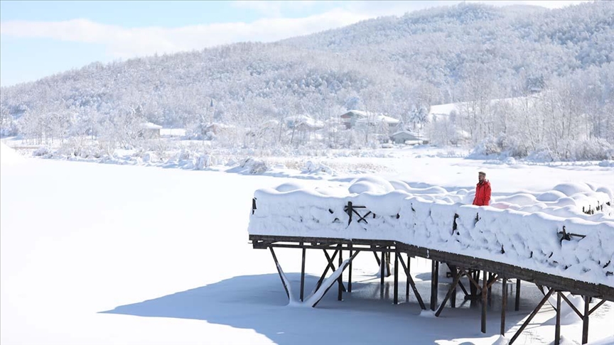 Beyaz örtüyle kaplanan göl, dron ile havadan da görüntülendi.