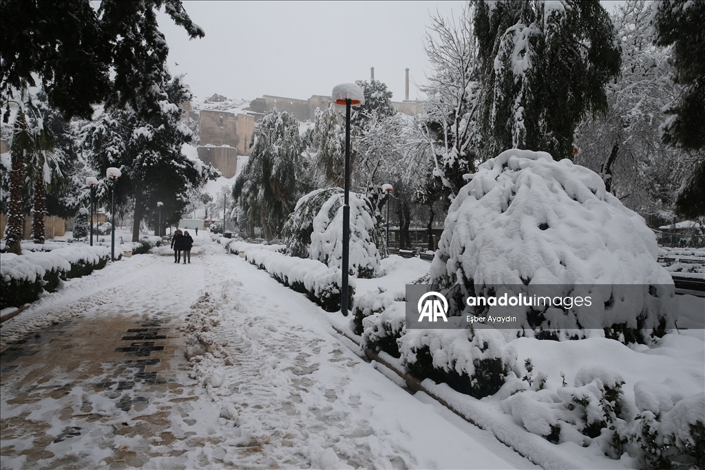 Şanlıurfa'da etkili olan kar, tarihi Balıkgöl Yerleşkesi ve Şanlıurfa Kalesi'nde güzel görüntüler oluşturdu.