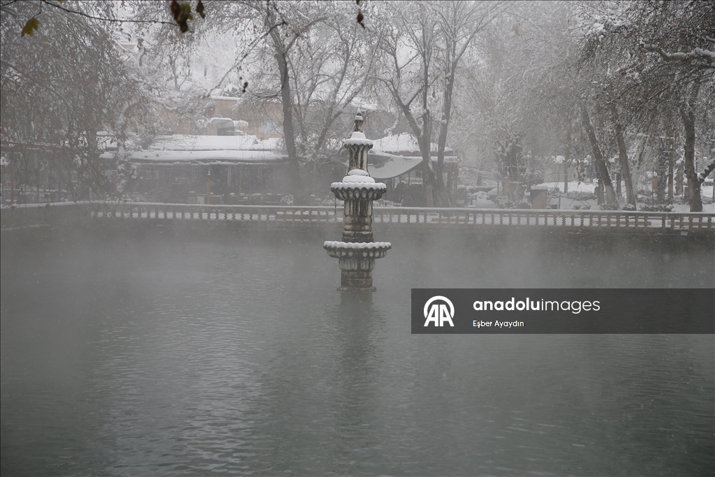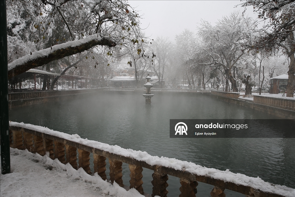 Şanlıurfa'daki tarihi Balıklıgöl karla beyaza büründü