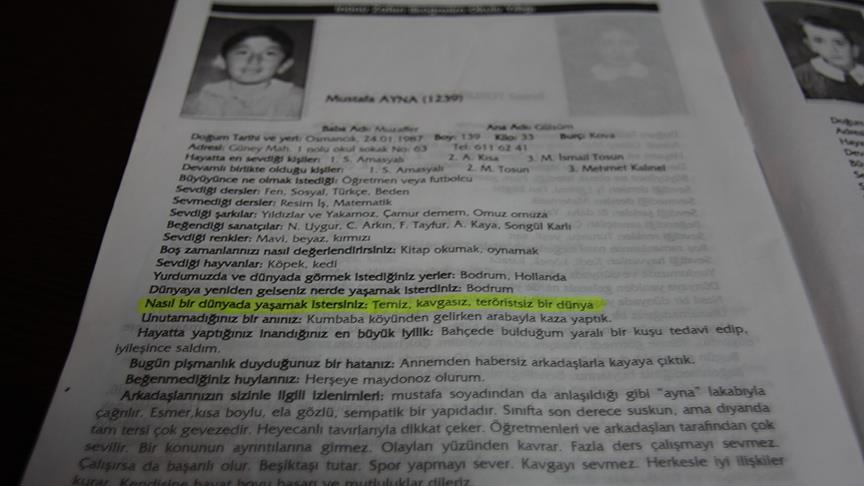 Mardin'in Derik ilçesinde bir eve düzenlenen operasyonda şehit düşen Astsubay Üstçavuş Mustafa Ayna'nın ilkokul 5. sınıfta hazırlanan okul yıllığındaki "Nasıl bir dünyada yaşamak istersiniz?" sorusuna "Temiz, kavgasız, teröristsiz bir dünya" cevabını verdiği ortaya çıktı.