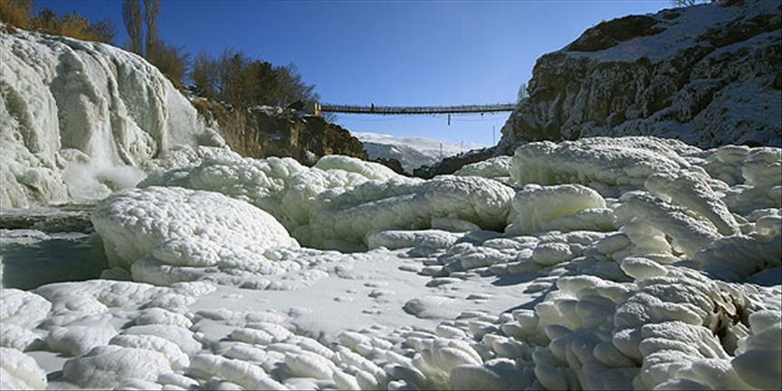 Tendürek Dağı'ndan kaynağını alan, Bend-i Mahi Çayı üzerindeki Muradiye Şelalesi kışın bir başka güzelliğe bürünüyor.