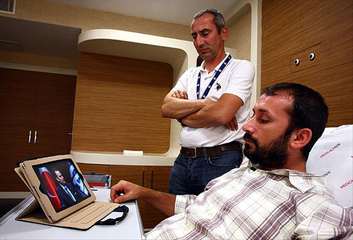 Suriye'deki olayları takip ederken keskin nişancıların açtığı ateş sonucu ayağından yaralanan AA foto muhabiri Sinan Gül, 35 gündür tedavi gördüğü Medicalpark Bahçelievler Hastanesi'ndeki odasında, bilgisayarından AA Yönetim Kurulu Başkanı ve Genel Müdürü Kemal Öztürk'ün katılımıyla açıklanan AA'nın bir yıllık faaliyet raporu toplantısını izledi.