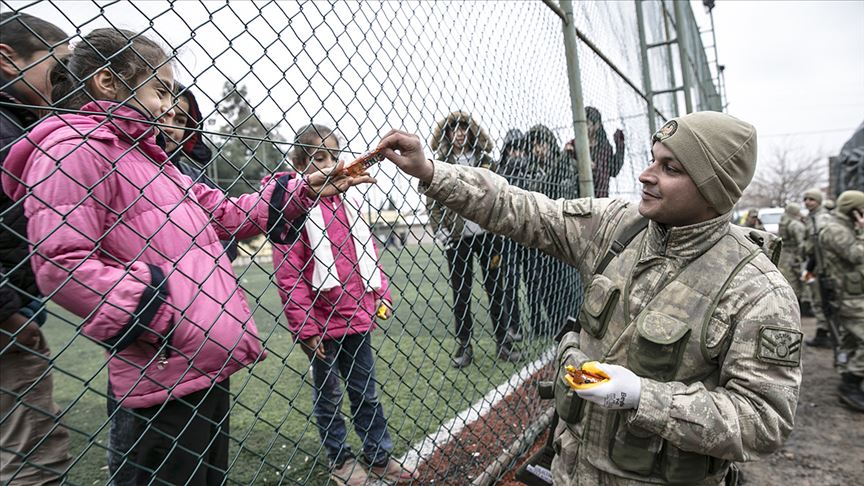 Çocukların sevgisine duyarsız kalmayan Mehmetçik de kendilerini selamlayan çocuklarla hatıra fotoğrafı çektirip çikolata dağıtıyor.