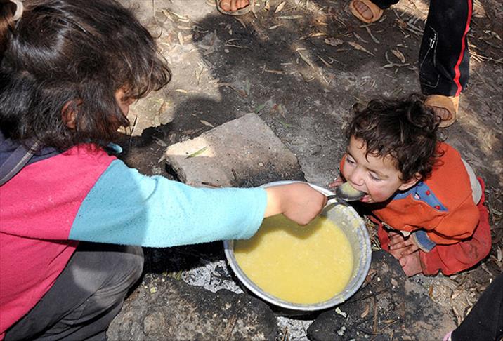 Çocuklar, annelerinin Türkiye'den gönderilen malzemelerle yerde yaktığı ateşte pişirdiği çorba ve patatesle karınlarını daha sofra kurulmadan doyuruyor.