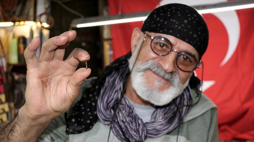 Ürettiği 7 milimetrelik en küçük bıçağı hediye eden "Şirin Baba", 1,5 santimetrelik hançer ile 2 santimetrelik açılır kapanır çakısına gözü gibi bakıyor.