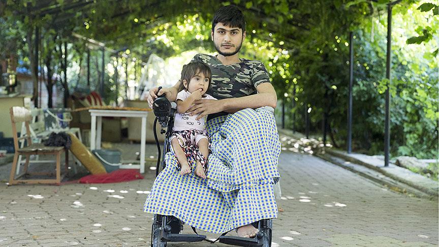 Suriye'nin Halep kentinde rejim güçleriyle çatışmada keskin nişancı tarafından vurularak yaralanan ve bir bacağı kesilen Kemal Elmasri, hediye edilen akülü arabayla 2 yaşındaki kızını parka götürebilecek olmanın mutluluğunu yaşıyor.