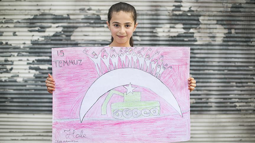Ülkelerindeki iç savaş nedeniyle sığındıkları Türkiye'de eğitimlerini de sürdüren Suriyeli miniklerin resimlerine, darbecilere karşı halkın kahramanlığı ve Türkiye sevgisi de yansıdı.
