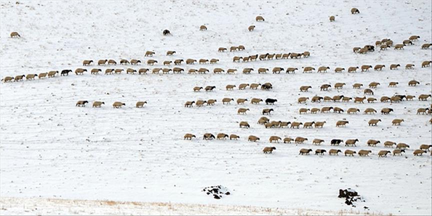 Van'da kar yağışı sonrası köyün yolunu tutan sürünün kuş bakışı görüntüsü ortaya seyri güzel bir manzara çıkardı.