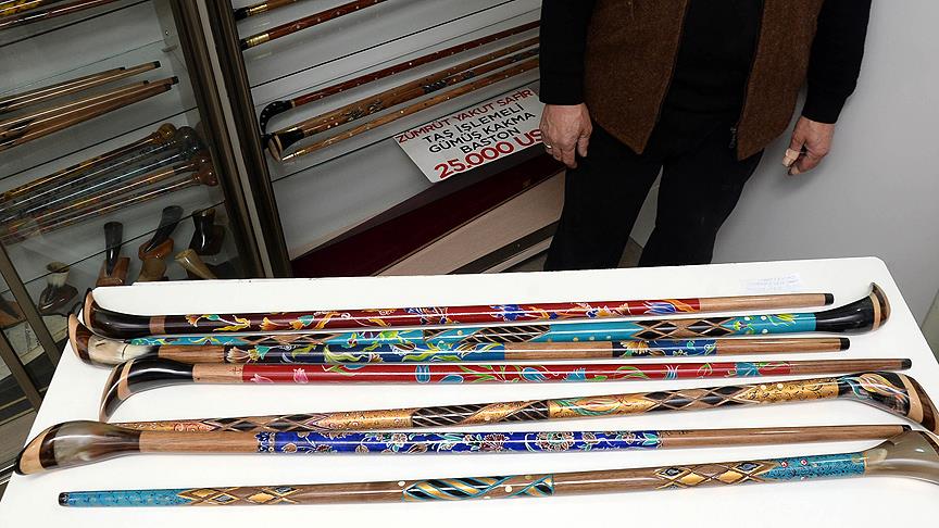 Baston ustası Cumali Birol, AA muhabirine yaptığı açıklamada, her yıl farklı desenlerle ceviz ağacı ve sığır boynuzundan baston ürettiğini anlatarak, bu yıl da çini desenli baston üretimine ağırlık verdiklerini söyledi.