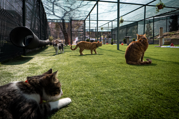 Proje kapsamında kurulan, kapalı ve açık iki bölümden oluşan alan, sevimli kedilerin doğal yaşam ihtiyaçlarına uygun şekilde tasarlandı.