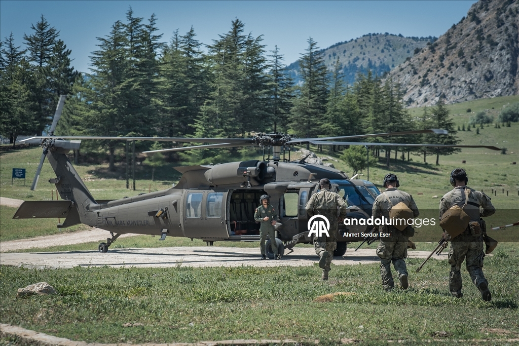 Keskin nişancılar, eğitim faaliyetleri kapsamında hedeflere belirlenen süre içerisinde helikopterden başarılı atışlar yaptı. Sabit olmayan alanda hedefleri tam isabetle vuran keskin nişancılar, görevlerini tamamladıktan sonra yere indi.