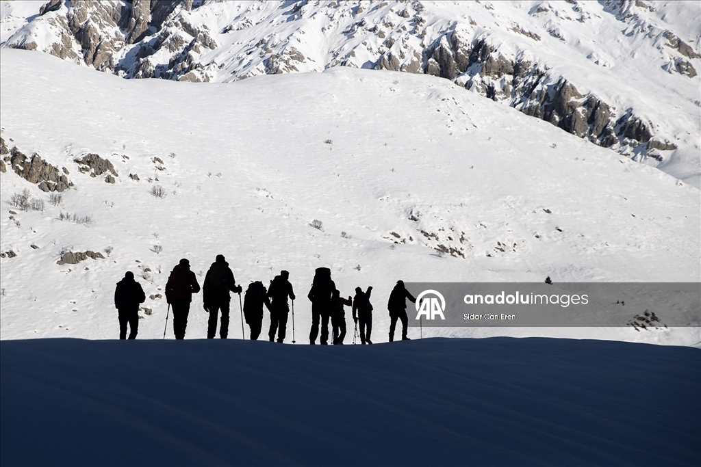 Tunceli'de kış tırmanışı yapan dağcılar 3 metrelik karda zorlu yolculuğa çıkıyor