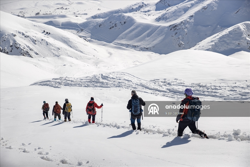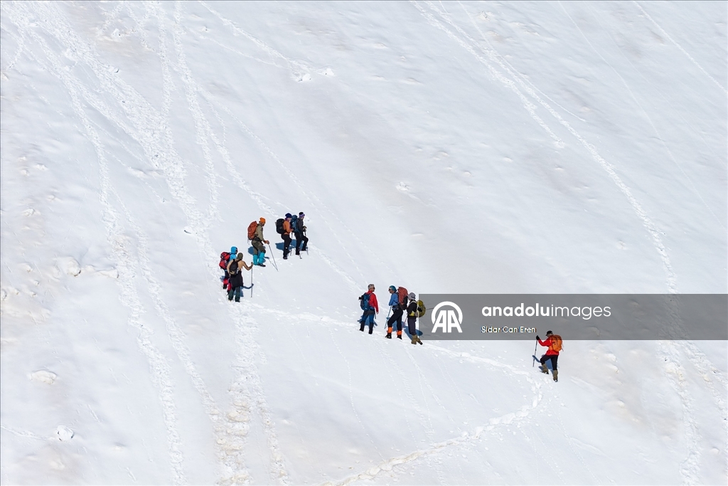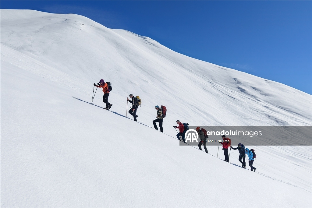 Araçlarıyla Gözeler köyüne bağlı Elbaba mezrasına gelen 10 dağcı, gerekli hazırlıklarını yaptıktan sonra beyaz örtü üzerinde tek sıra halinde yürüyüşe geçti.