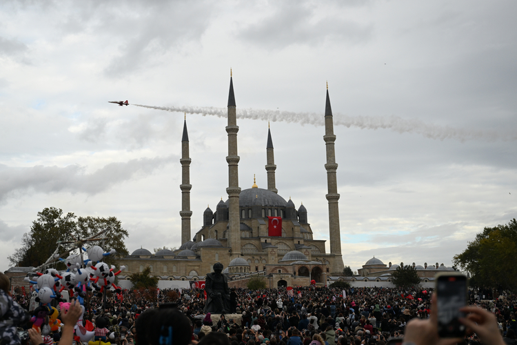 Türk Hava Kuvvetlerinin akrobasi timi Türk Yıldızları, Edirne Selimiye Meydanı semalarında gösteri uçuşu gerçekleştirdi.