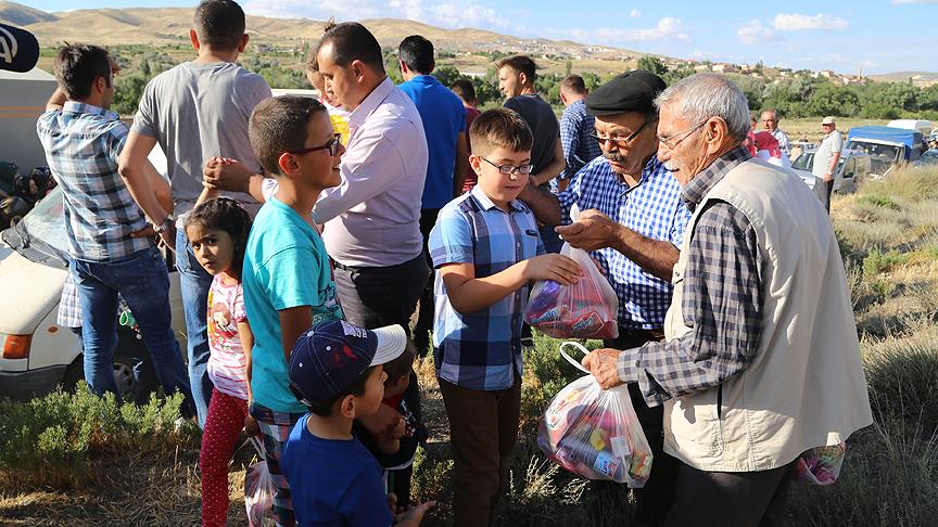 Köy imamı tarafından Kur'an-ı Kerim okunmasının ardından kabristan ziyaretini tamamlayan çocuklara, içinde çikolata, bisküvi, kek, kuruyemiş, şeker ve meyve suyu da bulunan paketler dağıtılıyor.