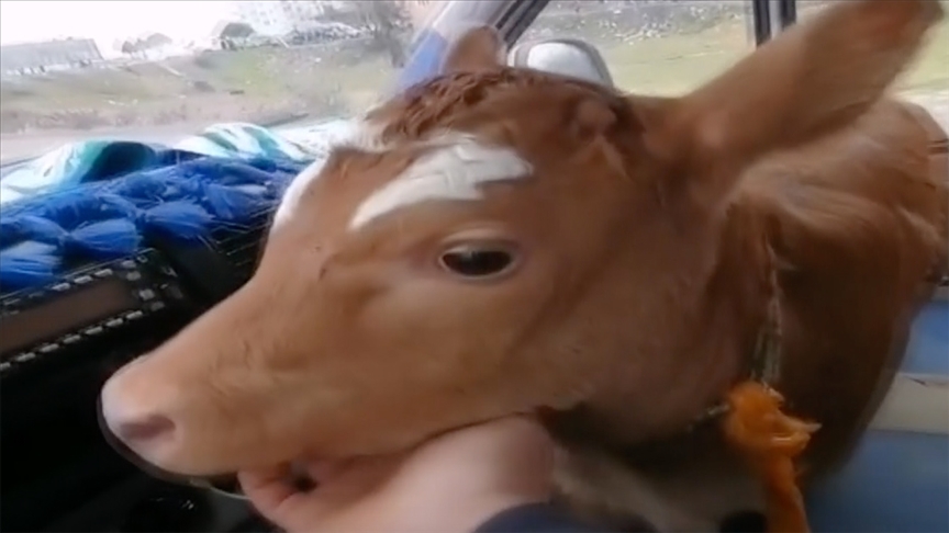 Ahmet Bostan, yağmurda ıslanmaması ve üşümemesi için buzağıyı Beyazsu köyündeki ahırın önüne kadar otomobilinin ön koltuğunda getirdi.