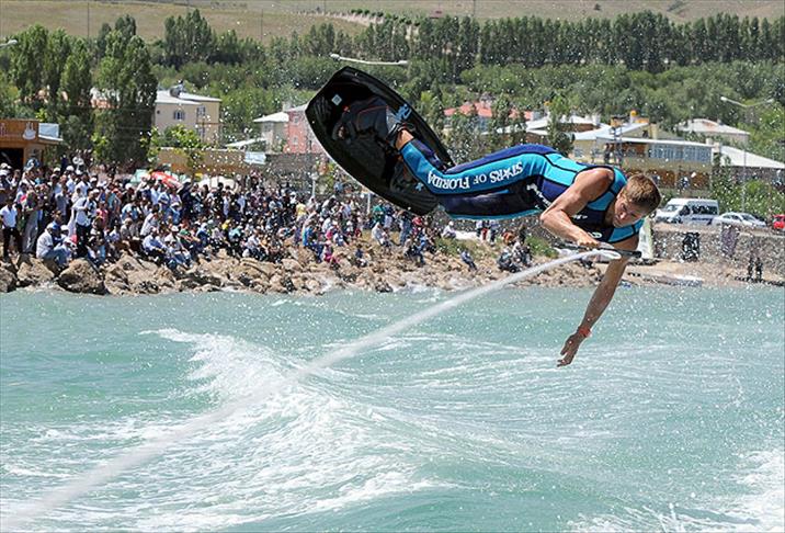 Gölde yaptıkları gösteri ile izleyenleri kendilerine hayran bırakan akrobatlar, su kayağı yaptıkları esnada Van yöresine ait "Şemmame" adlı oyunu da sergiledi.