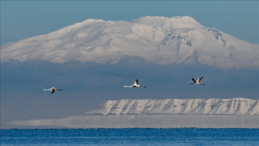Her yıl ilkbaharda Van Gölü havzasına gelen flamingolardan bazılarının bu yıl erken gelmesi dikkati çekti. Gölün Edremit kıyılarını mesken tutan flamingolar, kar sebebiyle beyaza bürünmüş Süphan Dağı ve gölün maviliğiyle güzel görüntü oluşturdu.