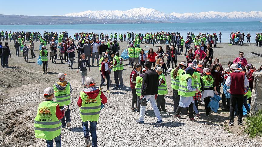 Van'da düzenlenen "İpekyolu Sahil Şenliği" kapsamında 3 bin öğrenci, Van Gölü kıyısında çöp topladı.