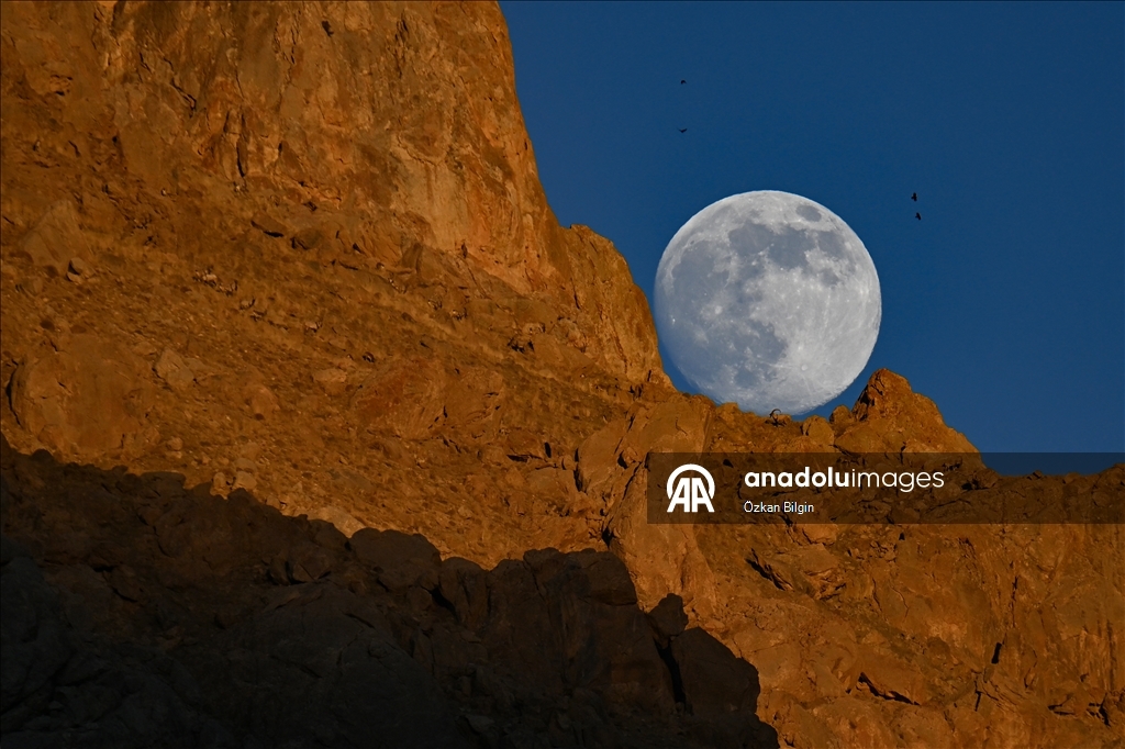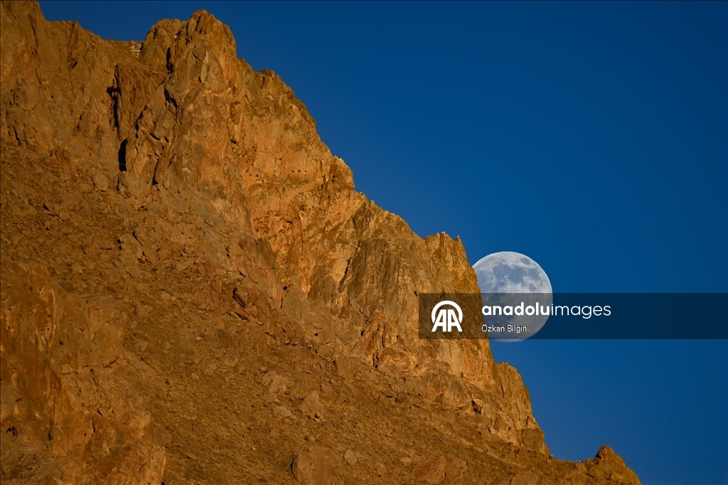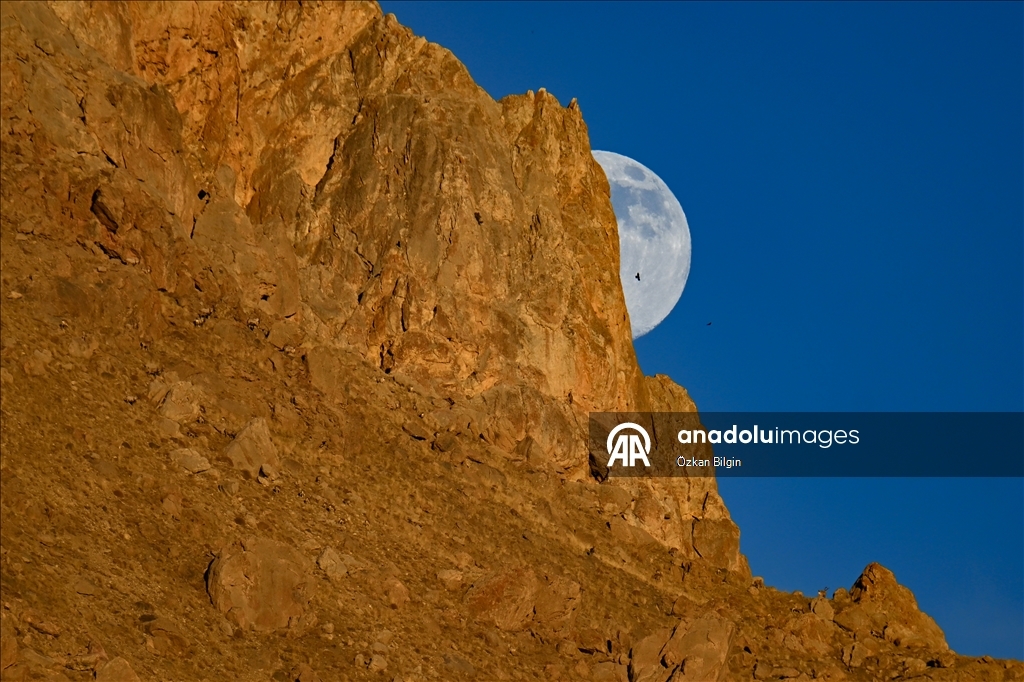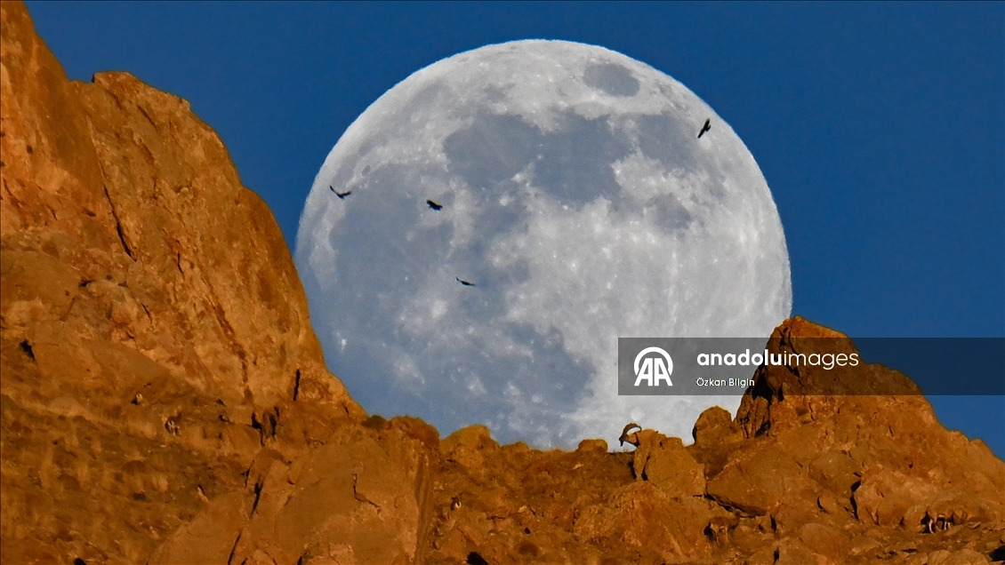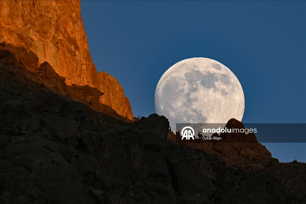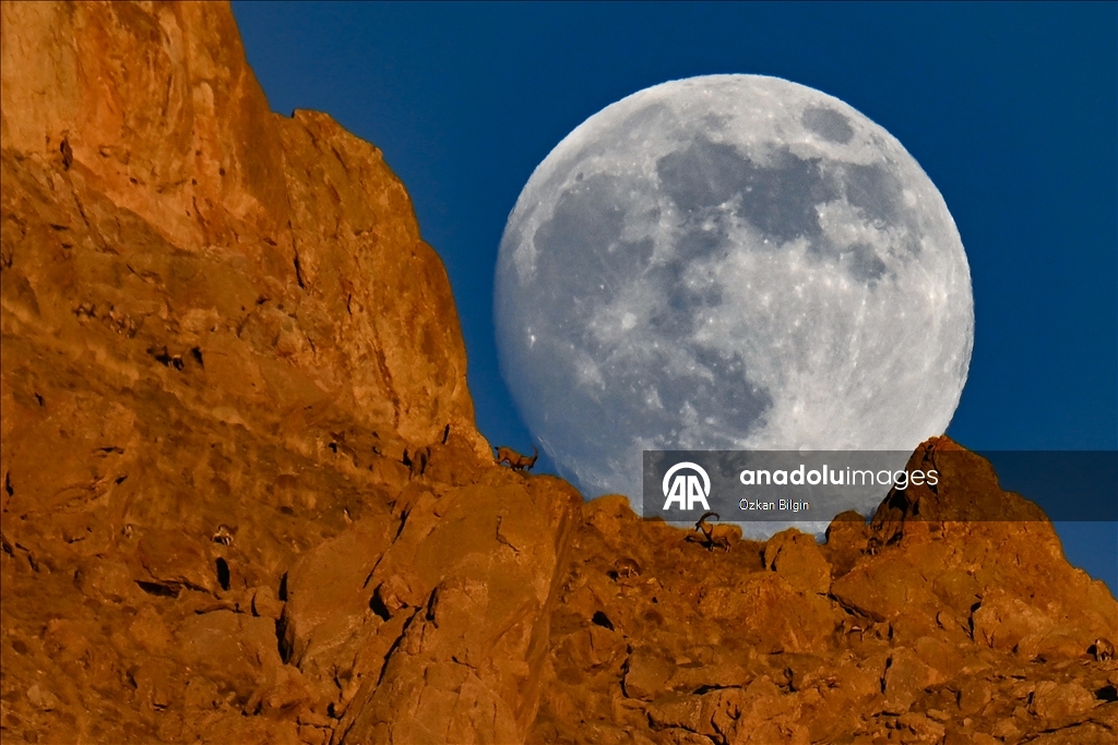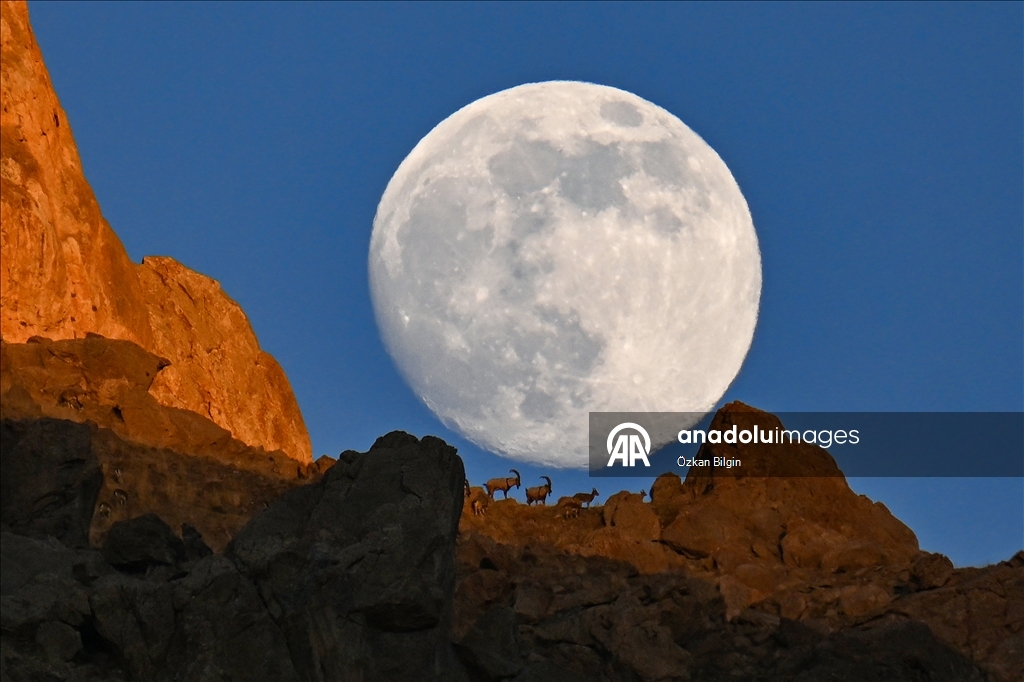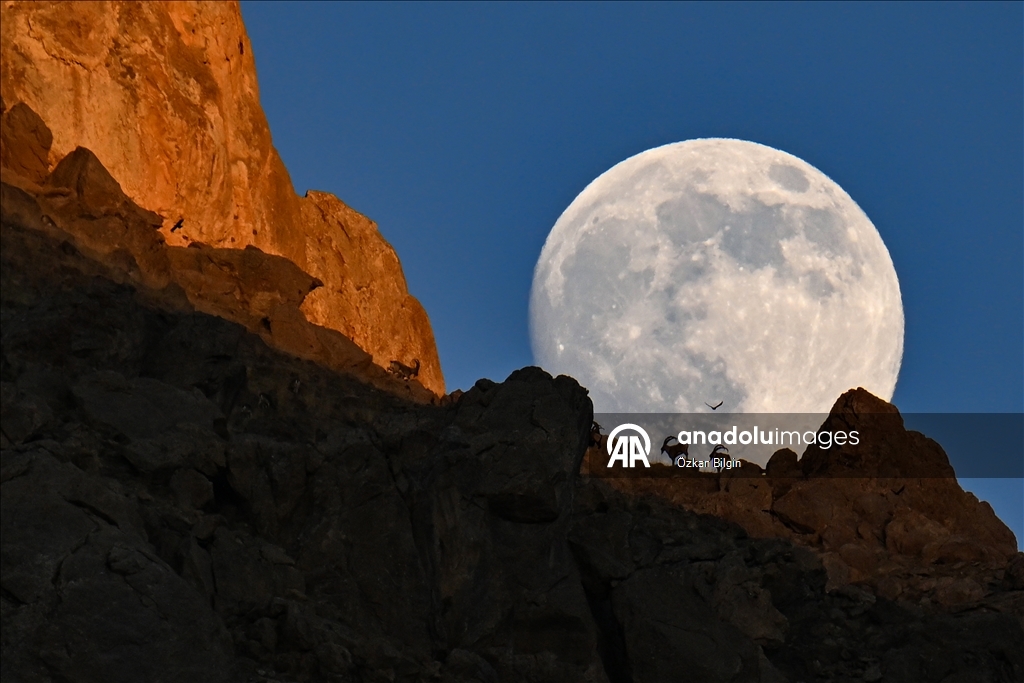 Van'ın Gürpınar ilçesinde nesli koruma altındaki yaban keçileri, dağın arkasından yükselen dolunayla birlikte görüntülendi.