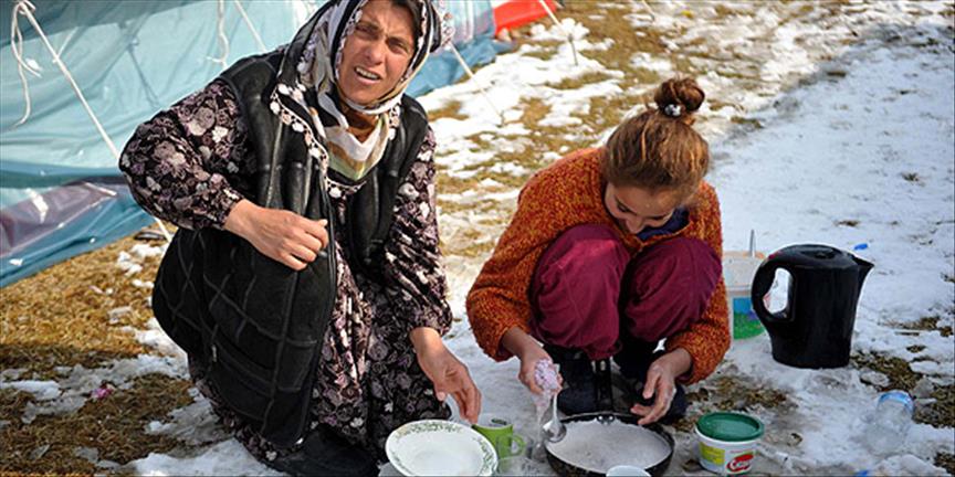 Van'da yaşanan iki büyük depremin ardından aileleriyle çadır kentlere yerleştirilen kadınlar, bir yandan soğukla mücadele ediyor, diğer yandan ailelerinin yemek ve bulaşık ihtiyaçlarını gidermeye çalışıyor.