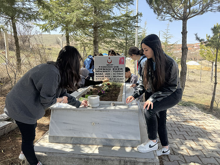 Yozgat Nida Tüfekçi Güzel Sanatlar Lisesi öğrencileri kent merkezi ve köylerdeki şehit kabirlerini ziyaret ederek, solmuş yazılarını ve bayraklarını yeniliyor, çevre temizliği yapıyor.
