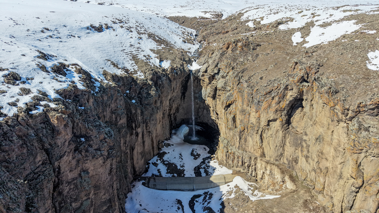 Yağışlar ve karların erimeye başlamasıyla yeniden akmaya başlayan şelale, kanyonun ortasından dökülen sularıyla dikkati çekiyor.